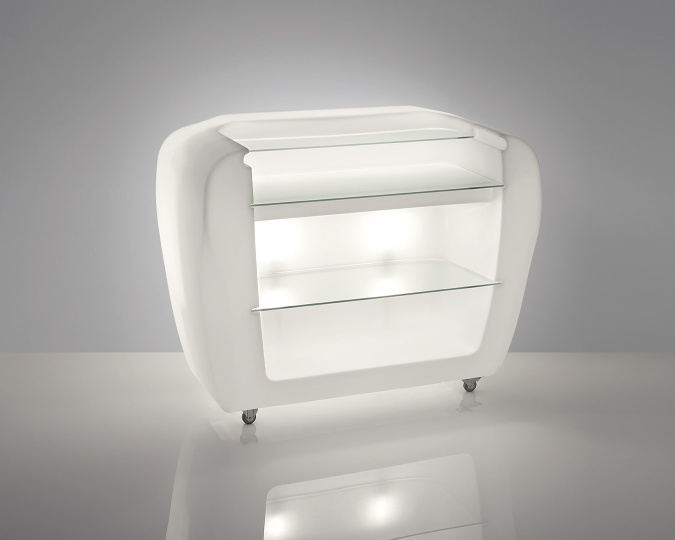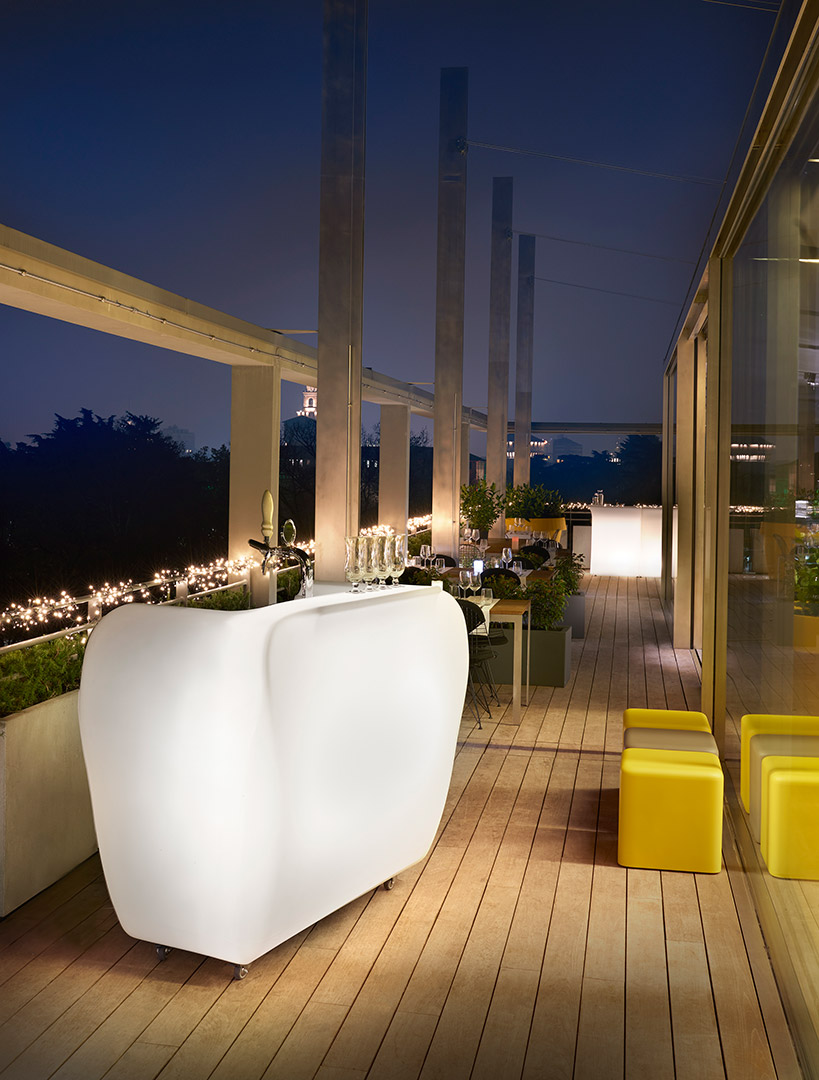 Roller Bar, designed by Gerd Van Cauteren, is a luminous bar counter, functional and contemporary. Its minimalist lines are a perfect mix between aesthetic and functionality: its rotating and lockable wheels are ideal to move it quickly and the internal shelves are useful as flat surfaces. Thanks to its functionality, Roller Bar could be a bar counter (adding also a beer dispenser) or a reception desk. Roller Bar is a luminous corner both in indoor and outdoor areas, and it could become a unique customized product with logos or images.